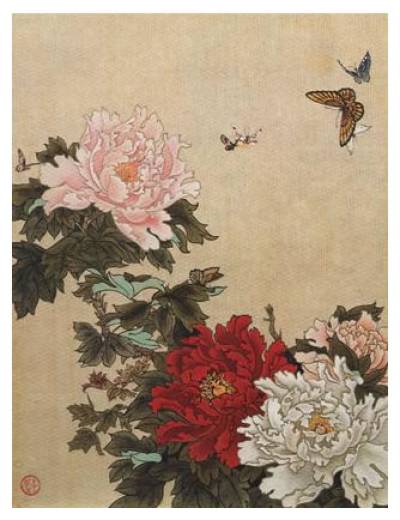 八 新草萌長,季花盛放,青蛙持傘,蝴蝶飛舞。雨後景象繽紛,猶比富裕之家,沉緬物質虛榮。